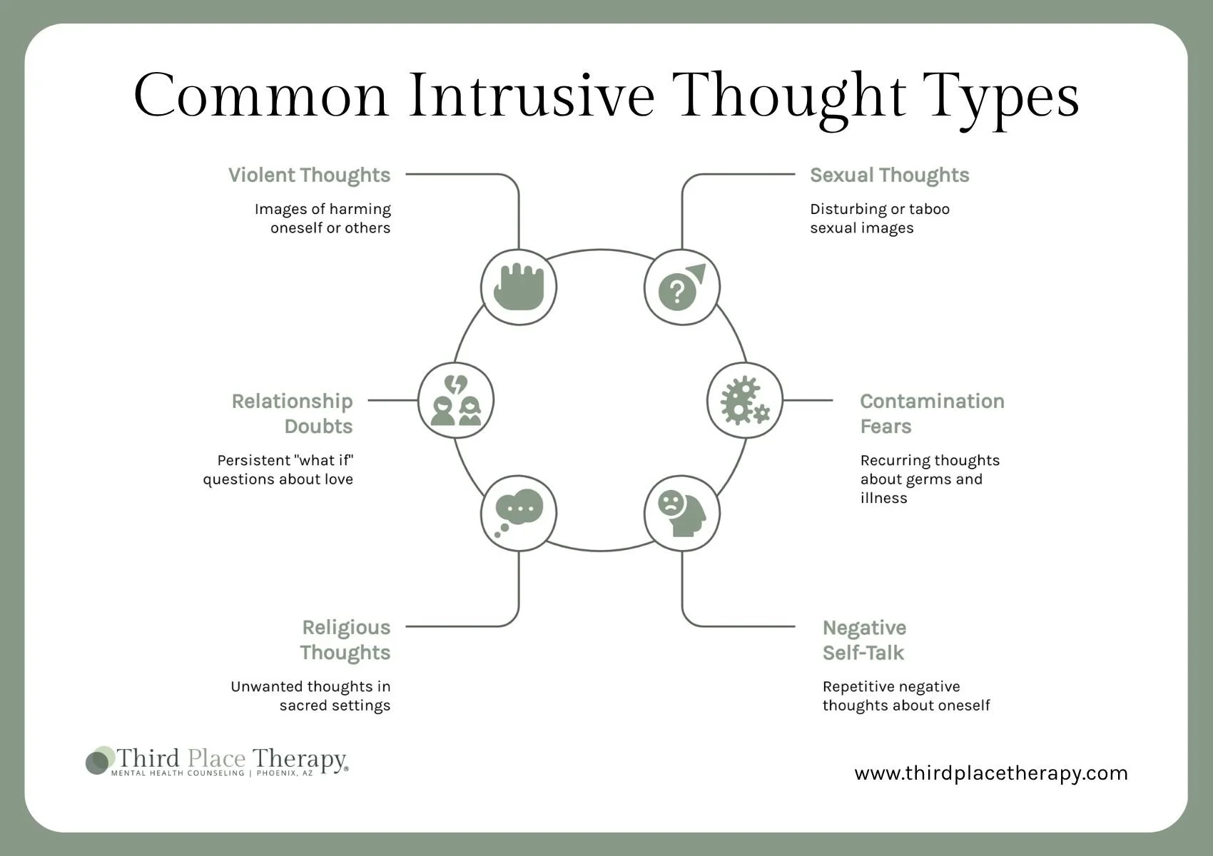 People with obsessive-compulsive disorder (OCD) often experience these thought categories most intensely, but they are not exclusive to OCD. Individuals with generalized anxiety disorder, post-traumatic stress disorder, postpartum depression, and ADHD also commonly report intrusive thoughts. New moms in particular may experience frightening thoughts about harm coming to their baby, which can be one of the most distressing experiences because it contradicts everything they feel for their child.
